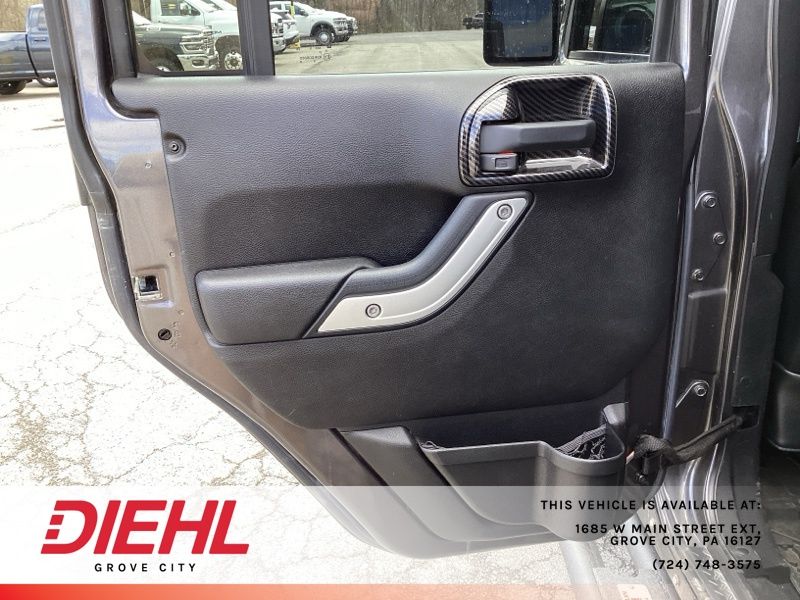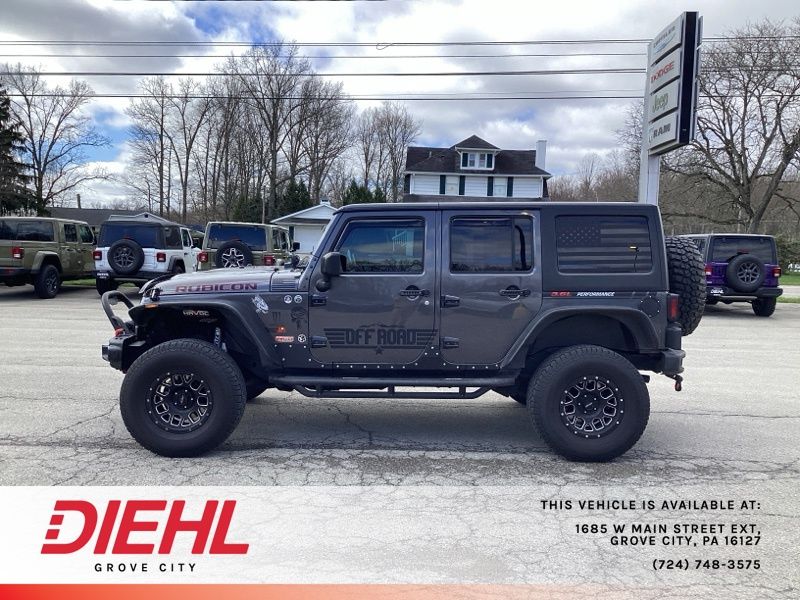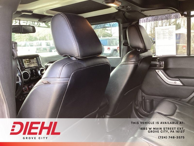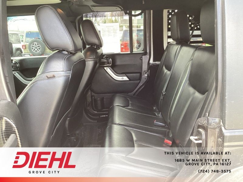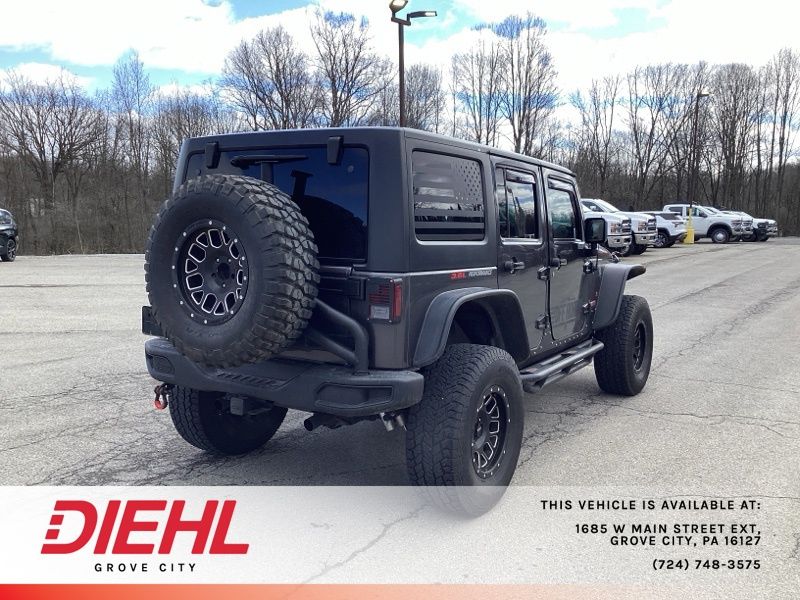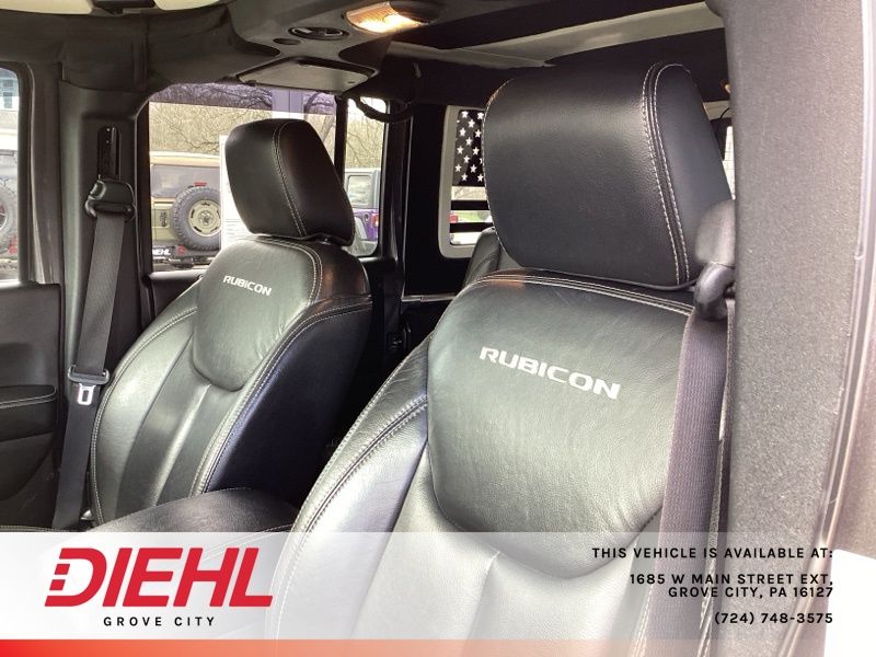 **NAVIGATION/NAV/GPS**, *BACK UP CAMERA*, **4X4**, 4-Wheel Disc Brakes, ABS brakes, Accent Stitching, Alpine 9-Speaker w/All Weather Subwoofer, Black/Chrome Screws Fuel Filler Door, Chrome/Leather Wrapped Shift Knob, Class II Receiver Hitch, Connectivity Group, Driver Height Adjuster Seat, Dual front impact airbags, Front anti-roll bar, Front Seat Back Map Pockets, GPS Navigation, Heated Front Seats, Hood w/Power Dome, Integrated roll-over protection, Jeep Trail Rated Kit, Leather Trimmed Bucket Seats, Leather Wrapped Steering Wheel, Low Gloss Black Wrangler Decal, Low tire pressure warning, Max Tow Package, MOPAR Slush Mats, Occupant sensing airbag, Premium Black Sunrider Soft Top, Premium EVIC Message Center, Quick Order Package 23J Rubicon Hard Rock, Rear anti-roll bar, Red Front & Rear Tow Hooks, Red Trail Rated Badge, Remote USB Port, Rubicon Hard Rock Package, Rubicon Hood Decal, Silver Interior Accents, Steel Front Bumper, Steel Rear Bumper, Sunrider Soft Top, Supplemental Front Seat Side Airbags, Tire Pressure Monitoring Display, Trailer Tow w/4-Pin Connector Wiring, Uconnect Voice Command w/Bluetooth, Vehicle Information Center, Wheels: 17" x 7.5" Polished Semi-Gloss Black. Recent Arrival! Clean CARFAX.