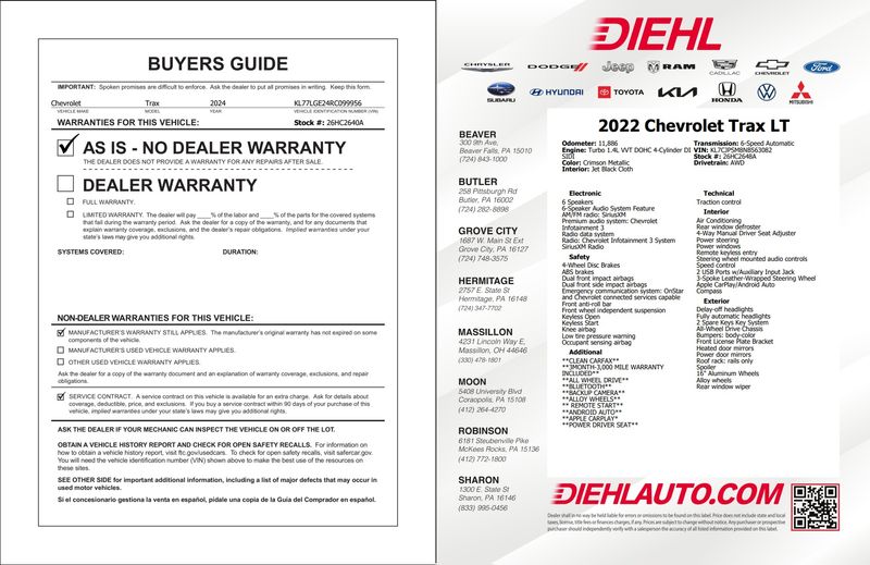 Diehl Automotive utilizes a system that generates market value pricing automatically for new and pre-owned vehicles and may cause errors, inaccuracies, or omissions. Some aftermarket additions or accessories may not be displayed properly. For accuracy, please contact the dealer for real-time, accurate pricing. A documentation fee of $398 applies and is not included in the pricing. Tax, title, and tags are also not included and must be paid by the purchaser. Some prices may include manufacturer-to-dealer offers that are not compatible with manufacturer special finance programs and/or lease offers. While great effort is made to ensure the accuracy of the information on this site, errors do occur, so please verify information with a customer service representative. This is easily done by calling us at (724) 608-3624 or by visiting us at the dealership.