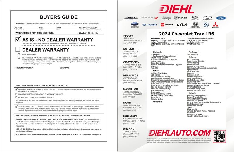 Diehl Automotive utilizes a system that generates market value pricing automatically for new and pre-owned vehicles and may cause errors, inaccuracies, or omissions. Some aftermarket additions or accessories may not be displayed properly. For accuracy, please contact the dealer for real-time, accurate pricing. A documentation fee of $398 applies and is not included in the pricing. Tax, title, and tags are also not included and must be paid by the purchaser. Some prices may include manufacturer-to-dealer offers that are not compatible with manufacturer special finance programs and/or lease offers. While great effort is made to ensure the accuracy of the information on this site, errors do occur, so please verify information with a customer service representative. This is easily done by calling us at (724) 608-3624 or by visiting us at the dealership.