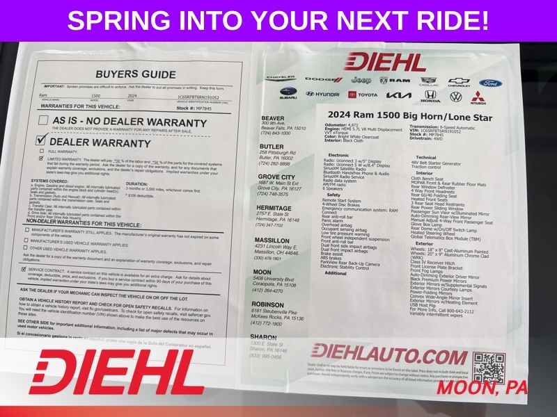 If you've been waiting for a truck that delivers V8 power, modern tech, and everyday comfort without overcomplicating things, this 2024 Ram 1500 Big Horn is ready to get to work. Stop by Diehl of Moon and see why trucks like this don't hang around for long.